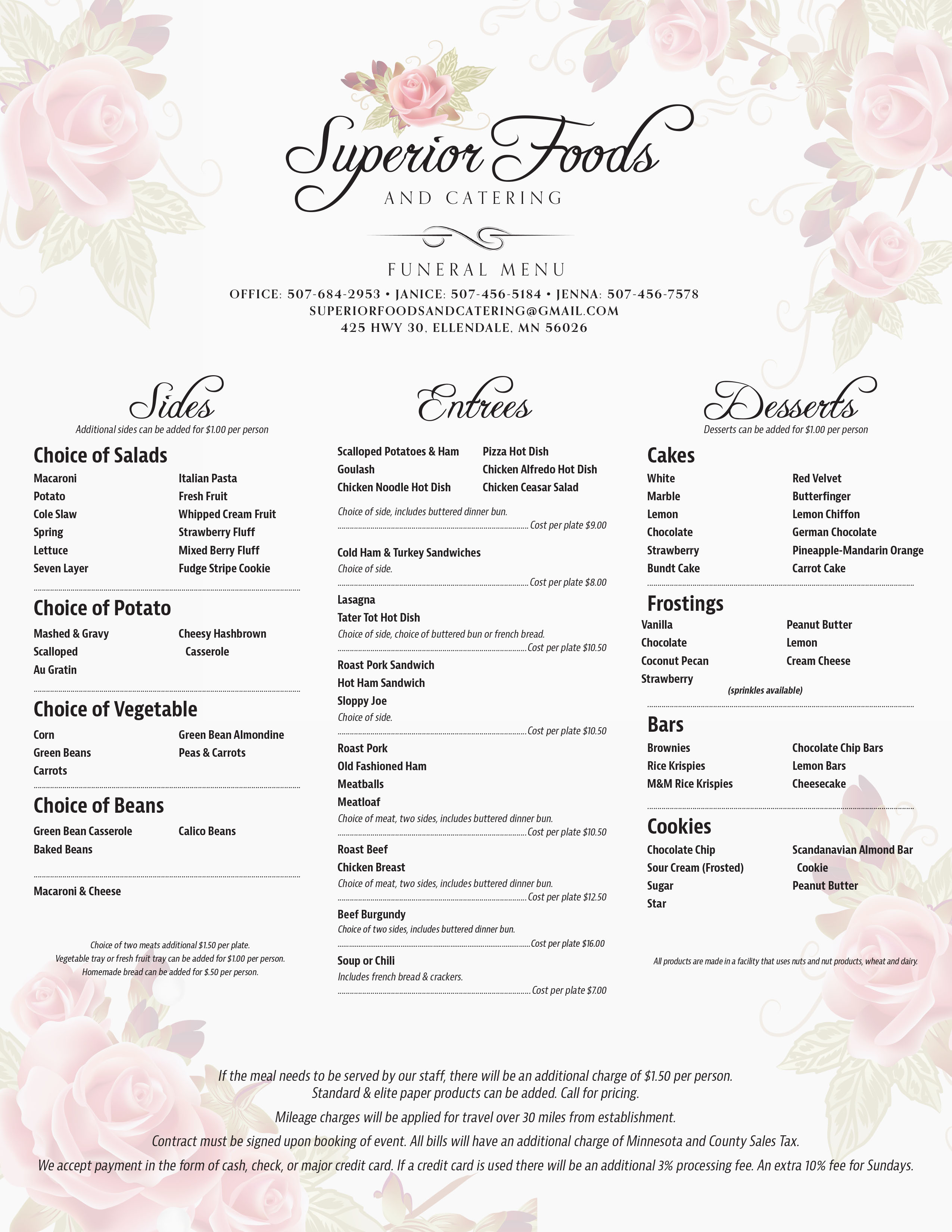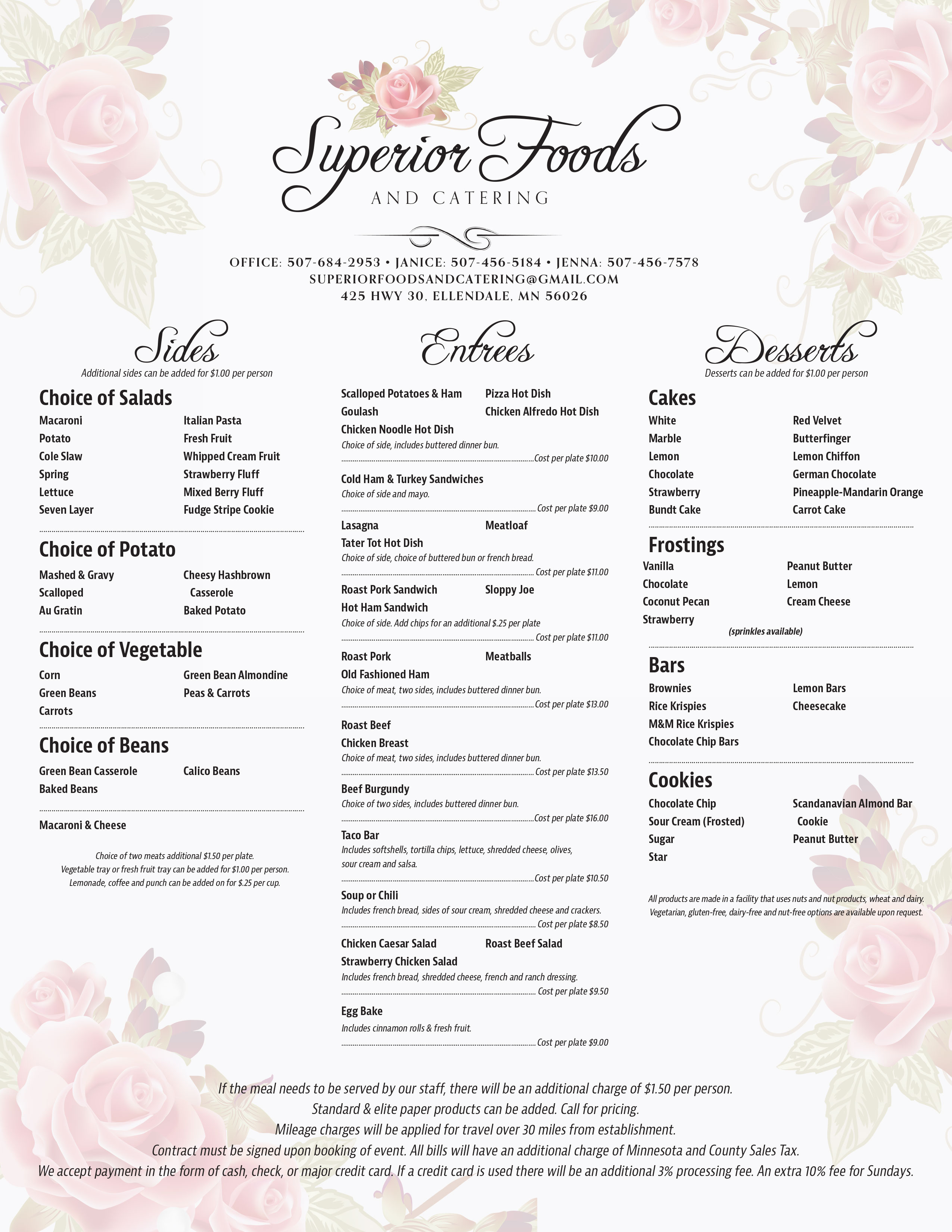 Mileage charges will be applied for travel over 30 miles from establishment. Contract must be signed upon booking of event. All bills will have an additional charge of Minnesota and County Sales Tax. We accept payment in the form of cash, check, or major credit card. If a credit card is used there will be an additional 3% processing fee. An extra 10% fee for Sundays.